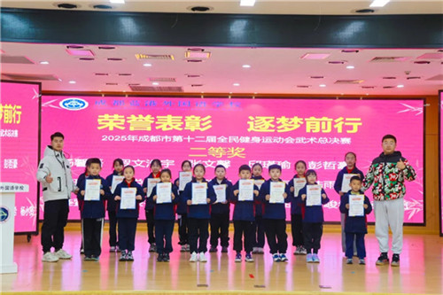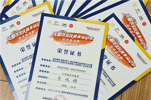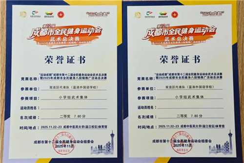 在线下市级赛事中,成都蓝港外国语学校学子同样不负众望。在“运动成都”成都市第十二届全民健身运动会武术总决赛暨2025年成都市全民健身八段锦推广活动总决赛上,杨炀馨语,罗文浩宇,张文馨等8名同学组成的团队荣获学校组集体八段锦二等奖;另有张小写、陆雨彤、李雅萱等27位学子在该赛事的小学组武术集体项目中斩获二等奖,用实力为学校争光。