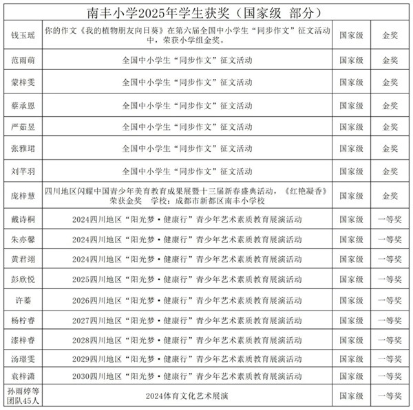 作为诗意育人的沃土,南丰小学以扎实的办学成效赢得广泛认可,全年斩获集体奖项52项,其中国家级5项、省级2项、市级9项、区级36项。
