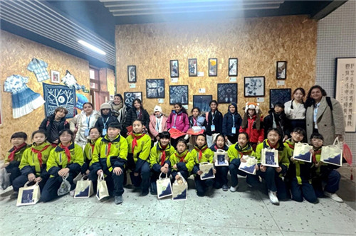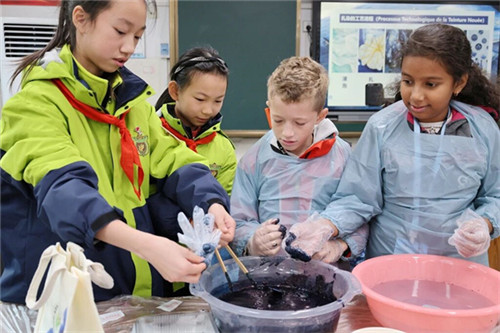 “自然而蓝”艺术工坊里,茶店子小学美术教师王斟详细解读非遗技艺的悠久历史与独特工艺,生动的讲解让法国师生兴趣盎然。创作环节中,茶店子小学学生化身小老师手把手指导法国学生捆扎、浸泡、染色……当素白布料蜕变成花纹别致的蓝染作品,法国学生的脸上满是成就感与喜悦,扎染冰箱贴等文创产品更让大家直观感受非遗文化的鲜活生命力。