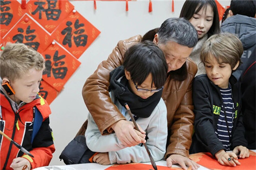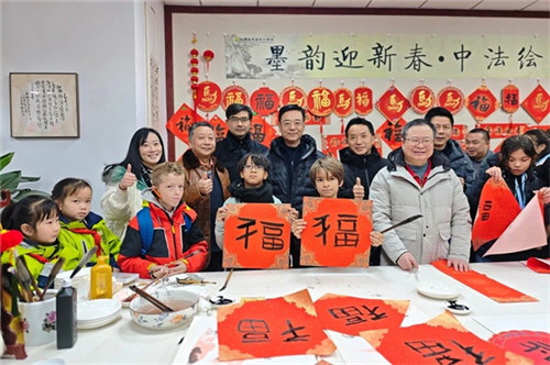 两位大师携弟子们俯身亲授技法,耐心指导法国学生执笔、运笔手把手教大家一笔一画临摹“福”字,指尖起落间,感受汉字的独特韵味让法国学生亲身触摸到中华书画的深厚底蕴,沉浸于中华传统艺术的魅力之中。