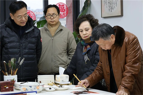 书画工作室里姚叶红、舒炯两位艺术大师凝神挥毫,笔锋流转间,山水画卷意境悠远,书法墨痕跃然纸上,墨香袅袅氤氲刚柔并济的书法风骨、灵动传神的山水意趣令人称绝。