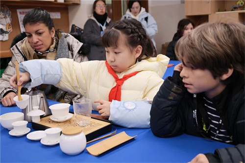 茶艺室内王霏大师从茶叶品类、冲泡技巧到待客之道、养生智慧,细致讲解中国茶文化的起源与传承,带领茶小学生温杯、置茶、注水、出汤……一系列动作行云流水,尽显茶道的从容雅致。茶香萦绕中,法国师生纷纷拿起茶具,在茶店子小学学生的细致指导下尝试泡茶,感受茶汤的醇厚回甘味觉的交融拉近了心灵距离,让这场跨文化的交流更添真切暖意。