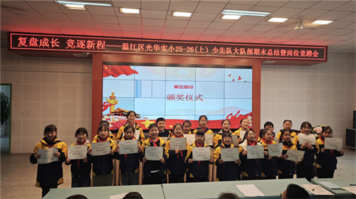 为全面复盘本学期少先队工作,凝聚团队力量,明确下学期工作方向,近日,成都市温江区光华实验小学大队部以“复盘成长,竞逐新程”为主题,召开期末工作总结会。4-6年级全体大队委、少先队国旗班及主持班成员参会,学生发展中心老师全程指导。