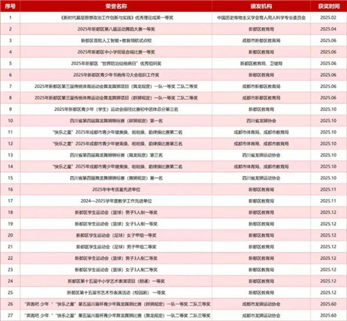 2025年,是成都市新都区香城中学大江中学建校以来的首个“收官年”。回望去年,该校全体师生凝心聚力,每一个拼搏的日子都闪闪发光,每一个坚实的足印都值得铭记。2025年,学校共获得学校荣誉27项;教师获奖206人次;学生获奖104人次。