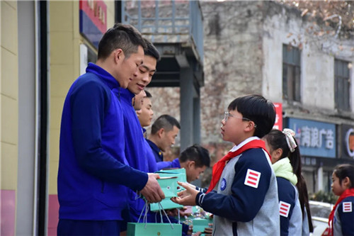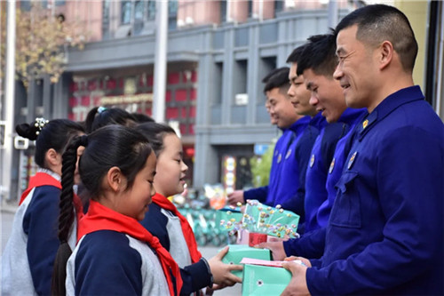 活动伊始,少先队员们排着整齐的队伍,将精心准备的礼物郑重送到消防员叔叔手中。