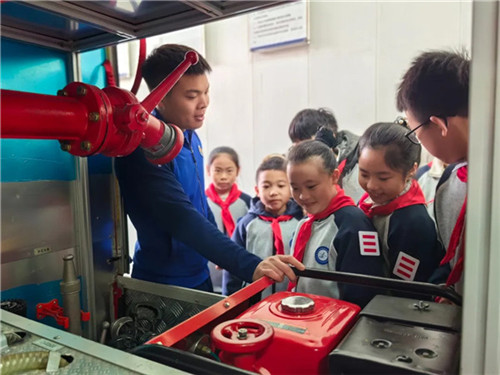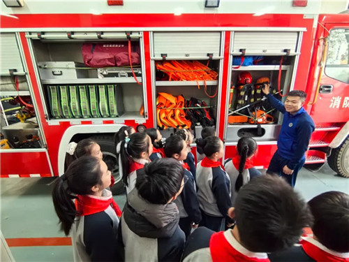 随后,在消防员的带领下,少先队员们开启了充满新奇的消防营区探秘之旅。排列整齐的消防车辆、功能各异的救援装备,瞬间吸引了孩子们的目光。消防员耐心细致地讲解着消防服、破拆工具、空气呼吸器等装备的用途和操作方法。孩子们看得聚精会神,也在专注的参观中加深了对消防员日常工作的认识和理解。