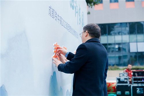 校长张礼洪与党委专职副书记杨自虎共同揭下图卷,活动迎来第一个高潮。一幅青绿山河图徐徐展开,红日初升、云雾缭绕,“春风得意”四字意蕴深远;“春”字之“人”与“得”字特意留白,待师生共绘。