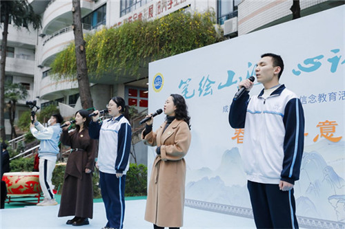 随后,成都铁中教科室副主任王琳、高三年级优秀教师代表谢一帆老师,与高三年级三班何宇轩同学、高三年级十班郭羽涵同学一同登台,唱响《一路生花》。歌声中,既有对备考之路繁花盛开的美好祝愿,更饱含着少年不负韶华、奔赴理想的坚定信心。