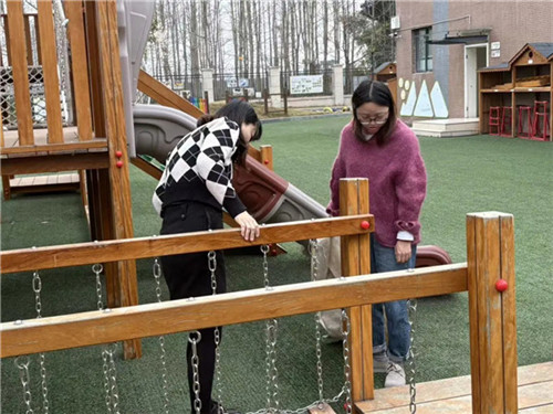 为保证幼儿户外活动安全有序开展,预防意外发生,安全小组对全园所有户外设施设备、大型玩具以及体育器械设备进行认真、细致的排查。