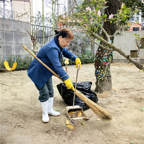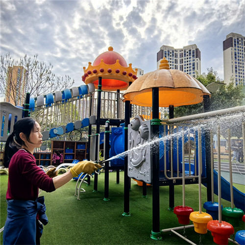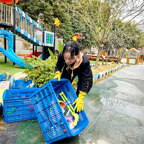 大厅的玻璃擦得透亮,走廊的地面一尘不染,楼梯扶手反复擦拭消毒;户外的滑梯、攀爬架等大型游乐设施,经过清水冲洗、消毒液擦拭、阳光晾晒的“三重洗礼”,焕然一新;园区的绿植被修剪得整整齐齐,枯萎枝叶尽数清理,让春日的校园更显生机盎然。从室内到户外,从主干道到隐蔽角落,政通幼儿园教职工用脚步丈量责任,用行动守护洁净。