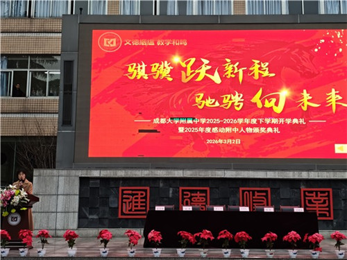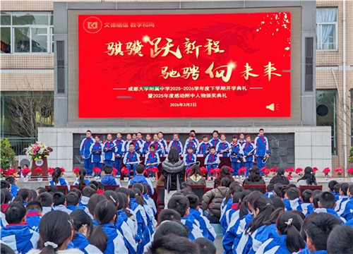 春日开新局,策马赴新程。3月2日,成都大学附属中学(以下简称:成大附中)三友路校区、安宁河校区的学子们身着整齐校服,以饱满昂扬的精神面貌齐聚操场,举行2025-2026学年度下学期开学典礼。本次典礼以“骐骥跃新程 驰骋向未来”为主题,在庄重的仪式与温暖的期许中,共同按下新学期的启动键。