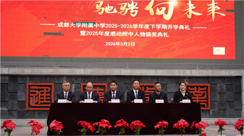 成都大学附属中学党总支书记晏小华为全体师生送上新学期寄语,他回顾了2025年学校取得的累累硕果,向每一位奋力拼搏的师生致以诚挚感谢;随后以“骐骥”为喻,寄语同学们怀骐骥之志,做心怀家国、向阳生长的追梦人;寄语老师们秉骐骥之勤,做学生成长路上的“大先生”,更鼓励全体附中人以勇毅之姿,在新学期携手同行、共赴新程。语重心长的致辞,让在场师生备受鼓舞、热血满怀。