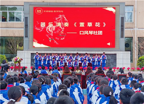 7点40分,三友路校区口风琴社团一曲《萱草花》悠扬奏响,拉开了典礼序幕;9点20分,安宁河校区合唱社团的《红旗飘飘》歌声嘹亮,尽显少年意气。
