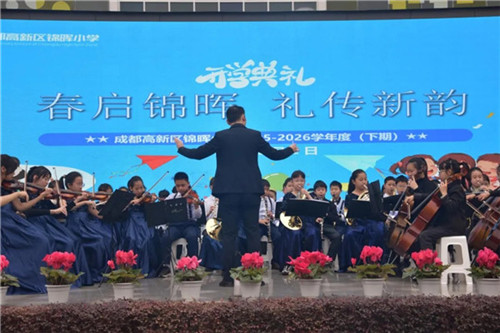 开学典礼上,成都高新区锦晖小学校长彭昌奎向全校师生送上新学期的期许,叮嘱孩子们传承中华传统美德,将礼仪融入日常学习生活,让“礼”成为成长的底色。