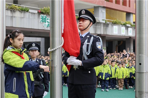 晨光映朝阳,红旗耀校园。开学典礼在庄严的升旗仪式中拉开帷幕,金牛公安分局反恐特警大队的警察叔叔与少年们迈着坚定的步伐走来,全体师生肃立注目,雄壮的国歌奏响,五星红旗冉冉升起,少先队员行队礼,目光灼灼望向国旗,爱国之情在心中升腾,奋进的信念在此刻悄然扎根。