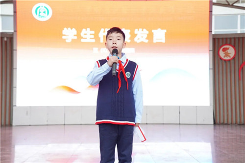 学生代表刘宽禹登台分享假期所感,他言辞恳切,带领大家誓言声声。青春路上,当笃行不怠;时代潮头,誓奋发有为。