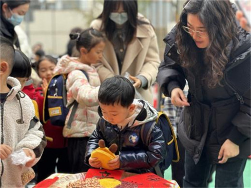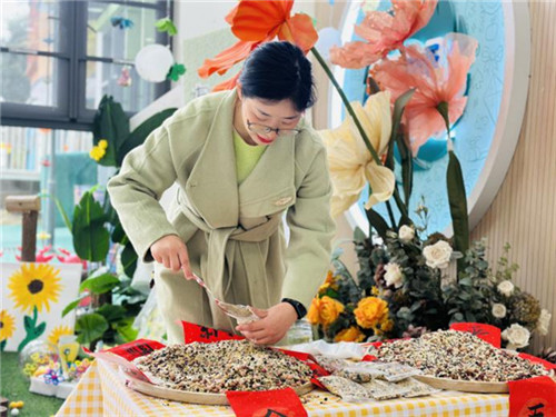 大厅里,“跨福气”打卡点超吸睛,宝贝们抬脚跨过福气门,接住幼儿园满满的开学祝福。最具特色的当属百家米签到环节,孩子们带着提前准备的小份五谷杂粮,小心翼翼地倒入簸箕中,在动手操作中感受传统民俗的趣味,也为新学期攒下满满的福气。