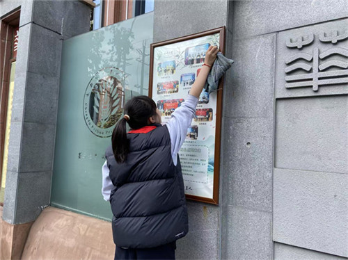 “这里有片小落叶!”“这个小纸屑我来扫!”同学们小手握着扫帚、端着簸箕,认真地把校园里、校门口的角落都扫了个遍,把校园外墙的宣传栏擦得干干净净,大家都笑着说:“宣传栏变亮啦!”