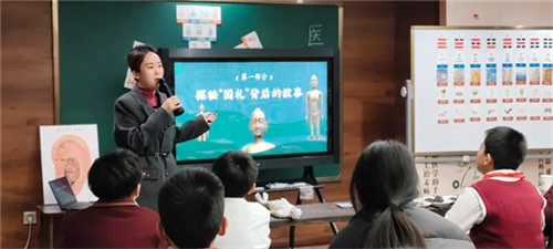 大课间功法展示结束后,李慧老师在少年中医学堂内给同学们带来了一堂生动有趣的中医药活动课《探秘祖国传统医学——从针灸铜人到春季养生》。课堂内容丰富、层层递进,让孩子们在趣味互动中走近中医、爱上中医。