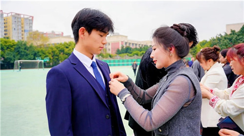 “行成人礼”环节将仪式推向高潮。父母为孩子佩戴成人徽章,学生向父母行三鞠躬礼,感念生养之恩。