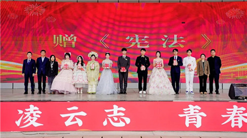 校领导向各班赠送《中华人民共和国宪法》,标志着学子从此肩负公民的责任与义务。