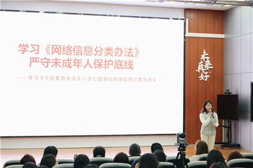 学校党总支委员、副校长黄艳组织全体教师专题学习《可能影响未成年人身心健康的网络信息分类办法》,深入解读未成年人网络信息保护新规,重点强调了学校工作中涉及学生影像及个人信息使用的“四条红线”。黄艳希望全体教师时刻绷紧法治意识这根弦,将新规要求内化于心、外化于行。