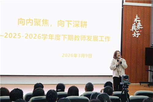 赖晗梅指出,新学期将以“向内聚焦、向下生根”为核心路径,紧扣“十五五”发展规划,激发教师内驱力,夯实专业内功。赖晗梅希望全体教师在专业精进中收获职业幸福,在生命对话中回归教育本真,在体验生活中拓宽育人边界,构建开放性、低控制、高柔性的自组织,以数智赋能推动学校高质量发展。