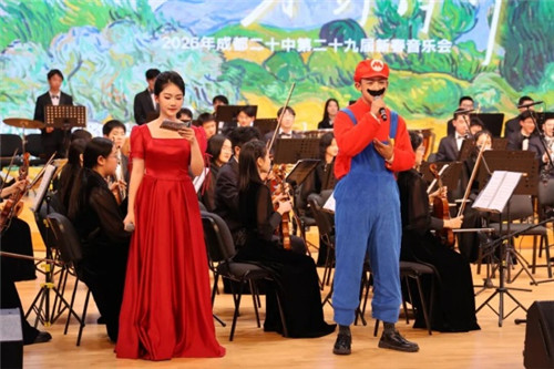 民乐合奏《美美与共》《奇迹》奏响中华传统音乐的时代新声,尽显新时代民乐的创新魅力。《美美与共》以“各美其美,美美与共”为创作内核,融合二胡、古筝、竹笛等多种民族乐器,勾勒出民族团结、共生共荣的美好画卷;《奇迹》将民乐的细腻婉转与交响乐的恢宏气势相融,歌颂平凡生活中的不凡,传递勇往直前的青春精神,与二十中学子的精神风貌高度契合。而管弦乐《超级马里奥》的奏响,瞬间点燃现场氛围,经典游戏旋律唤醒童年记忆,让音乐会在经典与潮流的碰撞中更具青春活力。