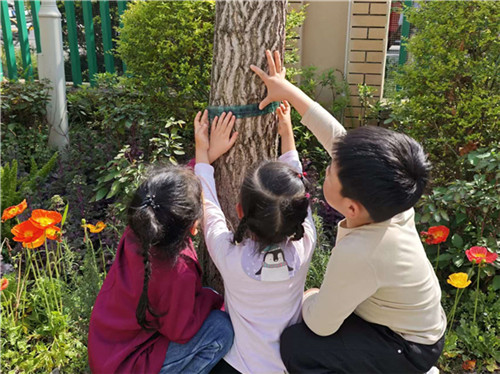 根据小中大不同幼儿年龄特点,教师通过故事、动画等形式科普植树节知识,孩子们触摸树干、丈量树木、设计名牌,在亲身体验中感知自然。