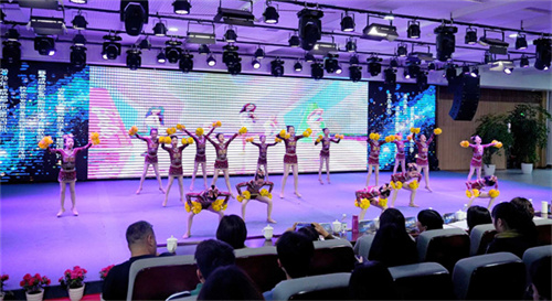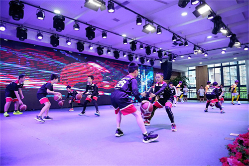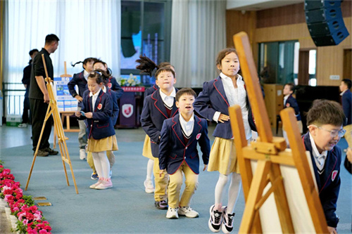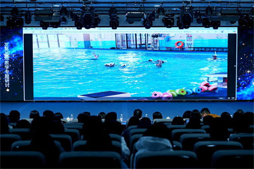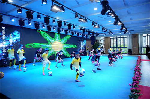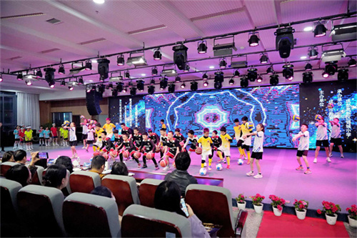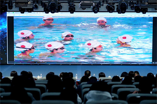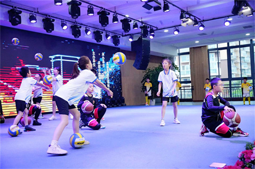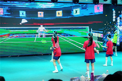 紧接着,学生社团轮番登场:球类、跳绳、花样游泳、健美操等项目依次呈现,孩子们在动感音乐中挥洒汗水。舞台灯光聚焦处,社团AI互动表演吸引了全场目光——孩子们手持球拍,跟随电子大屏上虚拟对手的节奏灵活走位、挥拍击球,屏幕中实时呈现专业竞技画面,AI技术实现了虚拟与现实的趣味联动,将“数智+体育”的深度融合具象化呈现,台下与会同仁纷纷举起手机记录,惊叹声与掌声交织。