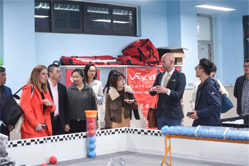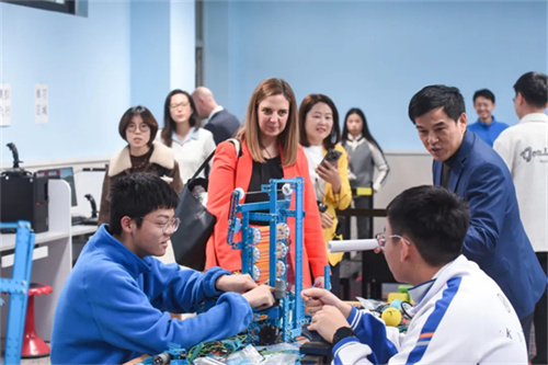 英国校长团一行参观了电子科技大学实验中学的校园环境和科创中心,重点观摩了vex机器人、MakeX机器人及无人机等项目的现场展示。学生们熟练地操作设备,团队成员之间配合默契,展现出扎实的工程思维与协作能力。来访嘉宾对学生们的编程能力、动手能力和问题解决能力表现出浓厚兴趣,不时与学生们交流技术细节。英国校长们对学校在科技创新教育方面的硬件建设、课程体系及学生培养成果表示高度赞赏。