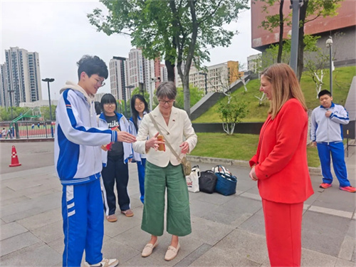 签约仪式后,英国校长们与电子科技大学实验中学的学生代表进行了面对面交流。学生们用流利的英语自信地与英国校长们沟通,分享学习生活与成长感悟。一位同学还主动展示起快板和京剧,并兴致勃勃地教英国校长们打快板,清脆的竹板声和欢快的笑声将现场气氛推向高潮。