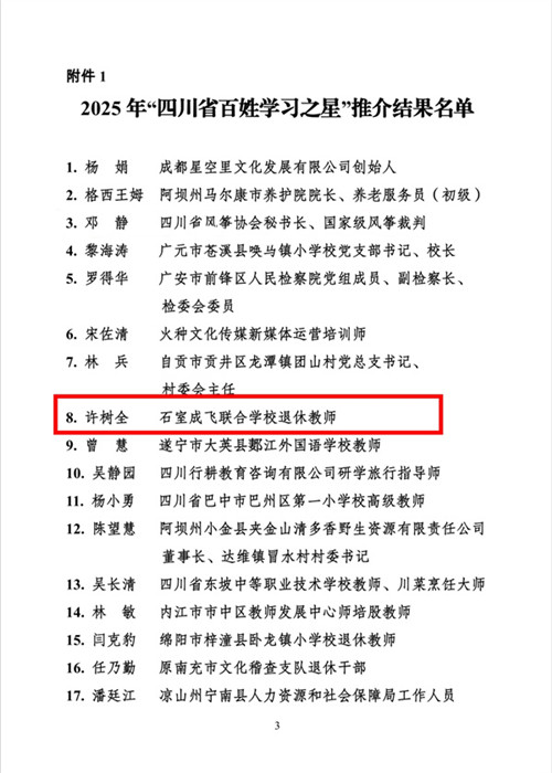 近年来,青羊区持续完善终身教育服务体系,通过构建“云上学习”平台、打造“三全”阅读生态圈、组建区域协同发展共同体等创新举措,培育出一批批优秀学习典型与教育工作者。未来,青羊区将继续以榜样为引领,丰富终身学习资源供给,让终身学习成为城市鲜明底色,为全省终身教育高质量发展贡献更多青羊力量。(赖波)