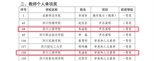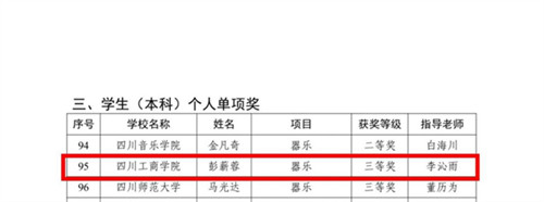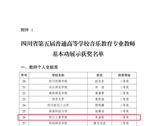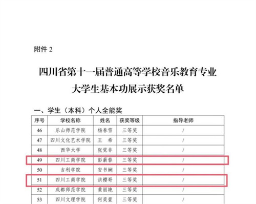 近日,由四川省教育厅主办的四川省第五届普通高等学校音乐教育专业教师基本功展示和四川省第十一届普通高等学校音乐教育专业大学生基本功展示在宜宾学院顺利举行。四川工商学院选派的师生不负众望,教师朱涵秋荣获个人全能二等奖、审美和人文素养展示项目一等奖、声乐演唱二等奖,学生彭薪蓉荣获器乐项目三等奖,洪樱哥、彭薪蓉分别获得本科组个人全能三等奖。