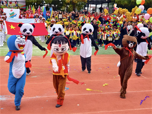 令人意想不到的是,由学校老师组成的裁判员方阵手持气球闪亮登场。两位男老师骑自行车开路,其中几位老师身穿玩偶服跳起舞来,引得场下的同学们阵阵欢呼。在热烈的气氛中,各方阵入场仪式走向尾声。