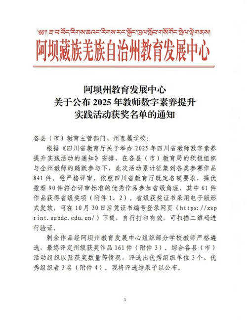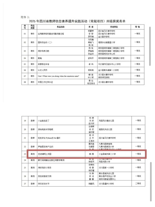 近日,小金县城关第二小学青年教师颜茜在2025年四川省教师数字素养提升实践活动中荣获州级一等奖!