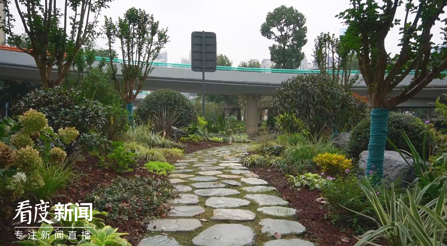 如何在这些剩余空间打造过程中,体现出公园城市特质的生态理念和生活场景?对此,负责对这一空间进行设计打造的上海园林绿化建设有限公司现场负责人邹人杰,专门给看度-公园城市频道记者介绍了他们在开发打造过程中的考量:“我们将桥底下的空闲用地都做成了街心小公园的形式,有坐凳、也有这种透水的路面,供老百姓来休闲娱乐使用。这次改造的绿化面积达27000平方左右,因为桥底下空间比较的有限,但为了凸显出绿色自然的城市生态特点,我们还专门增加一些花树,通过亚乔木的植物来提高空间内的视觉高度,再通过灌木和花境的手法来呈现整个空间的可视度和环境的舒适度。”