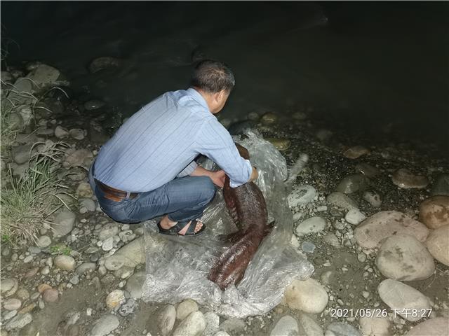 5月26日晚7点,成都温江区市民马先生在江安河温江公平段河边散步时,发现了河床浅滩处有一条“娃娃鱼”一动不动,马先生立即向相关部门求助。“自己都六十岁了,从来没见到过这么大的娃娃鱼,确实是稀罕动物,大家都应该保护。”马先生说。温江区农业农村局工作人员表示,娃娃对水质环境要求比较高,由于近期江安河水位下降,为了让娃娃鱼得到及时保护,随后,工作人员将娃娃鱼带到金马河水资源保护区将其放生。