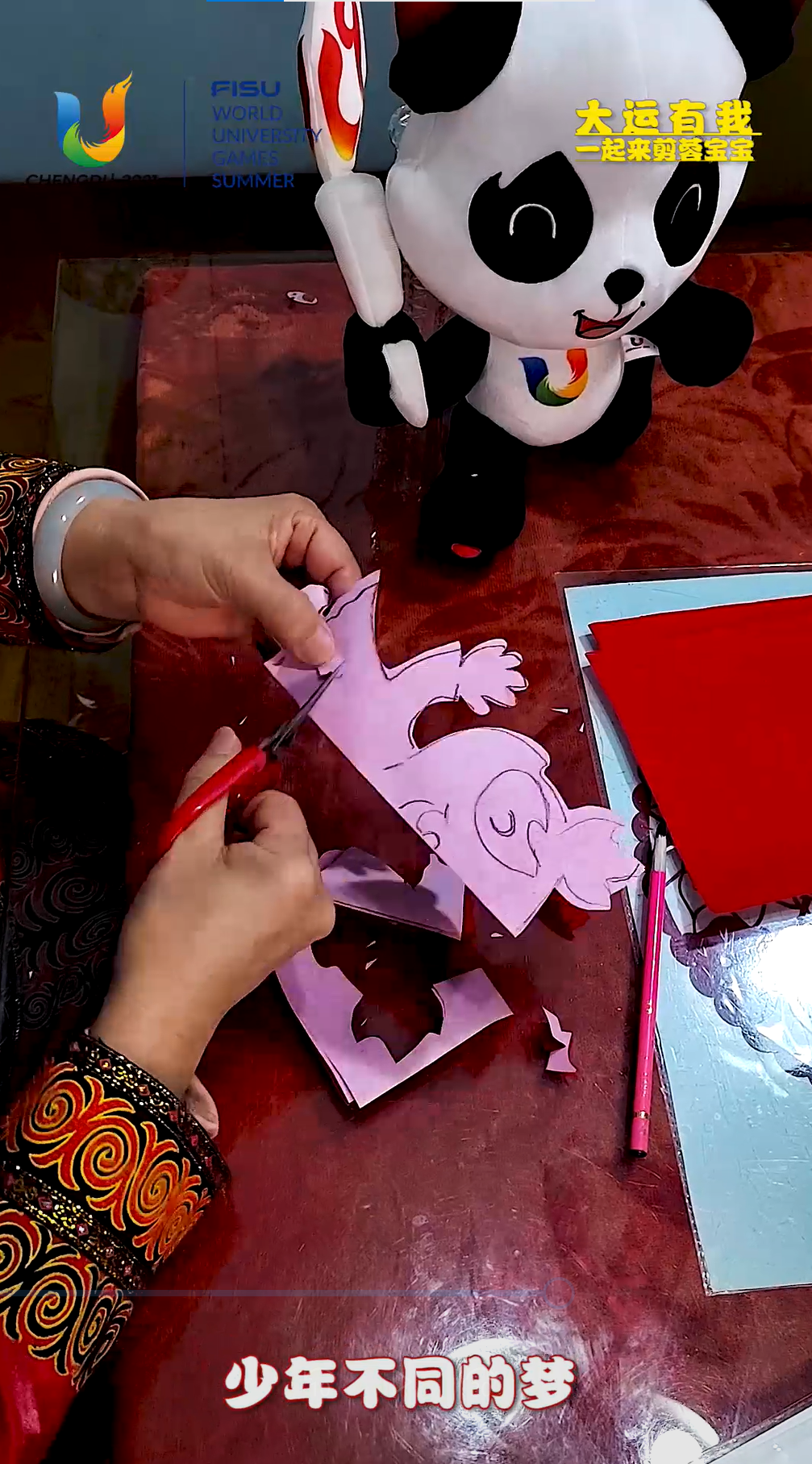 “一起来剪蓉宝宝”,邀请了民间高级艺术家、非遗(剪纸)传承人龙玲,以成都大运会吉祥物蓉宝宝为原型,创作了若干剪纸造型,并以最简单的造型为例,讲解如何用一张红纸、一把剪刀和一根铅笔,剪出自己的专属蓉宝宝。为居民提供一个在家里迎接大运的方案。