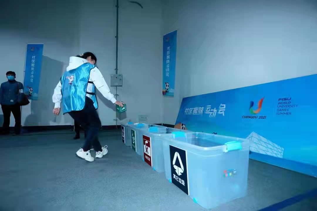 当天的鼓楼社区趣味运动会现场,开展了“绿色低碳接力赛”等趣味比赛,参赛队员将放置在A点不同类别的垃圾道具运送到B点并进行分类,在比拼接力速度的同时,考验参赛队员对于垃圾分类知识的掌握,用这种趣味游戏普及环保知识。
