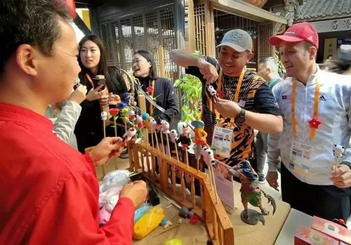 沐浴着春日的暖阳,代表团成员信步走在东门市井的街巷里,古色古香的建筑,一片片的灰瓦青砖,街角巷陌,老成都的市井风景无处不在。下沉市集广场、露天茶铺、凉亭水榭、吊脚楼,还有剃头采耳、抽陀螺、抖空竹等民间手艺,让大家完全置身于老成都烟火气十足的生活氛围中。大家一边走一边看,流连于剪纸、漆器、瓷胎竹编、糖画、泥塑等非遗项目展演摊前,连连点赞,惊叹手艺人技艺了得。随后,代表团成员还像成都市民一样,饶有兴致地坐在竹椅上品茗,同时欣赏四川扬琴、变脸等表演。“我们感受到了成都人生活的闲适,这样的节奏非常放松。”与记者闲聊时,南非代表团和荷兰代表团的成员纷纷表示,他们都希望大运会期间带运动员们也来走走看看,像成都人那样享受生活。