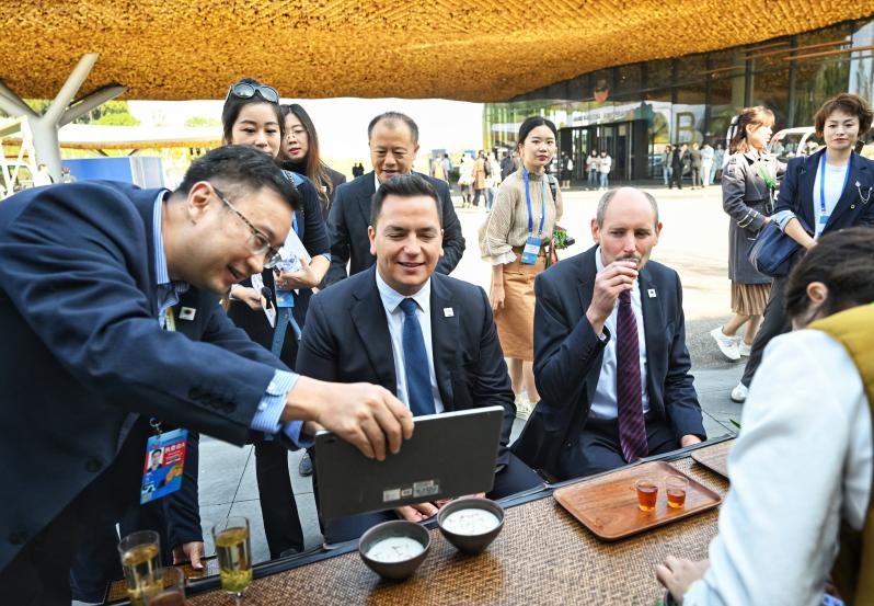 此时,国际园艺生产者协会主席莱昂纳多·卡皮塔尼奥、秘书长提姆·布莱尔克里夫、主席夫人玛丽莱娜·卡里耶里正在体验点茶工艺。在工作人员介绍下,他们了解了大熊猫国家公园的生态保护和生物多样性,品味了生态产品,了解了茶的生长环境与制作过程。“茶的口感很好,而且这个很有艺术感,是一种美学……”他们称赞着茶的品质,也为中国的文化传承和创新精神所折服。
