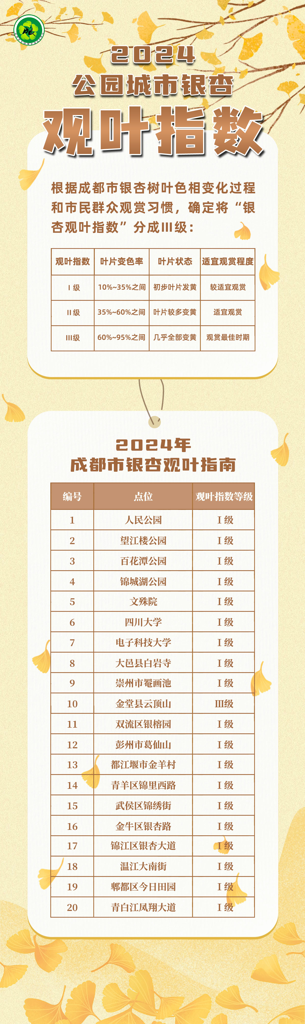 随着气温的不断走低,遍布成都的市树银杏也逐渐开始泛黄。为方便市民了解银杏美景呈现时间、观赏点位等,今日起,首期公园城市2024年银杏观叶指数正式发布。