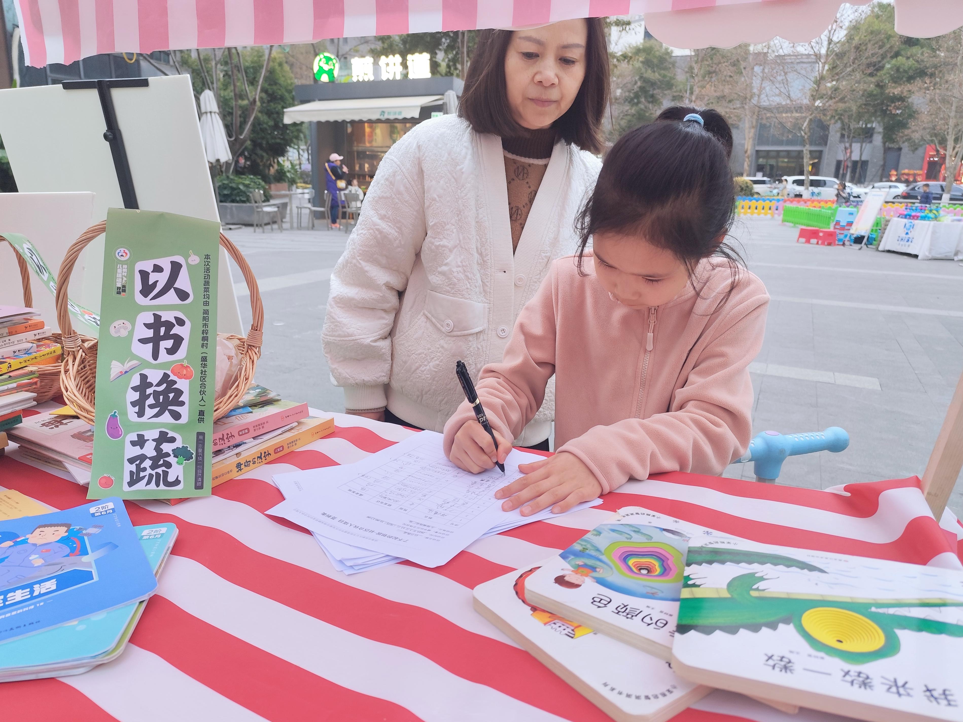 3月12日上午11点,汇锦城广场的“书摊”前围满了拎着图书的家长和孩子们。“这些读本是我家孩子很喜欢的一套绘本,内容生动有趣,我们也想把这套绘本送给村里的孩子们,让他们也能和自己家人一起阅读。”活动现场,一位妈妈说道,并让自己的孩子也挑选起了自己喜欢的蔬菜——这些时令蔬菜来自简阳市平泉街道梓桐村,早上8点才从地里摘下,10点已送到了盛华社区。社区居民木阿姨直接用推车拉了一箱的书来到了活动现场:“书太沉,有几次都推不动了,但一想到是捐给村里的孩子们,还是努力地推了过来。”更有不少居民朋友表示:“拿不拿蔬菜不要紧,主要是能为这样的公益活动出一份力。”仅一天时间,600多本童书和12件玩具“流动”到了置换点,它们将通过社区共建活动直抵梓桐村儿童之家。